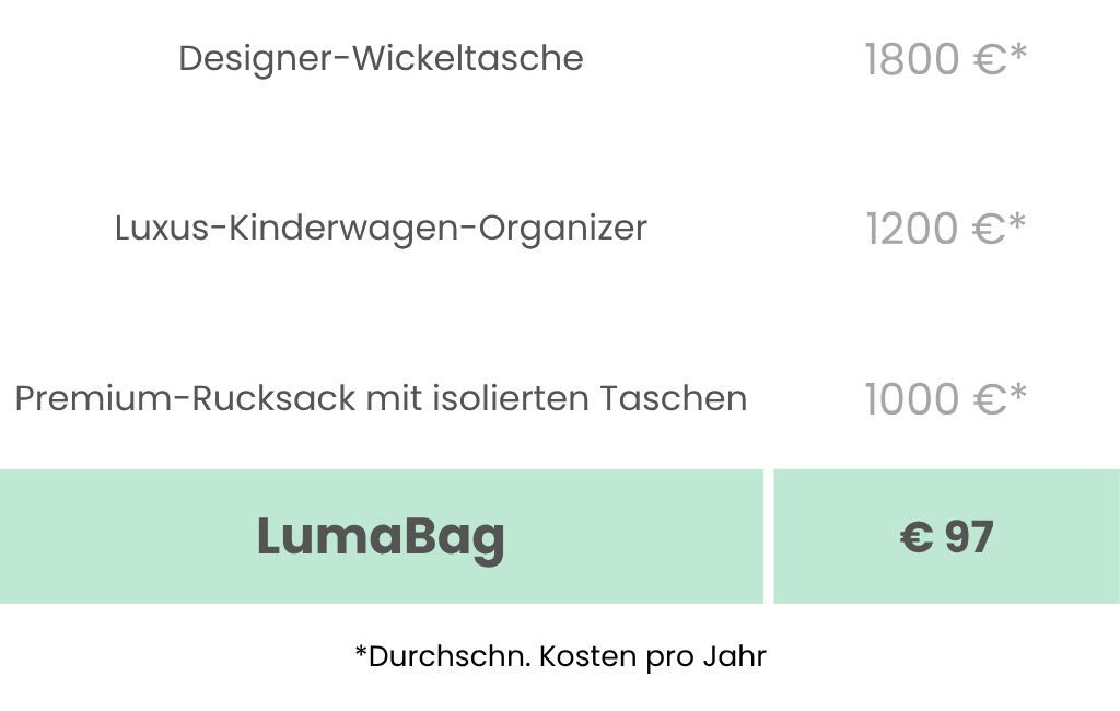 Warum Hunderte für separates Babyzubehör ausgeben, wenn die LumaBag alles in einem bietet? Sie bekommen Komfort, Alltagstauglichkeit und clevere Organisation – und das für nur einen Bruchteil der üblichen Kosten.